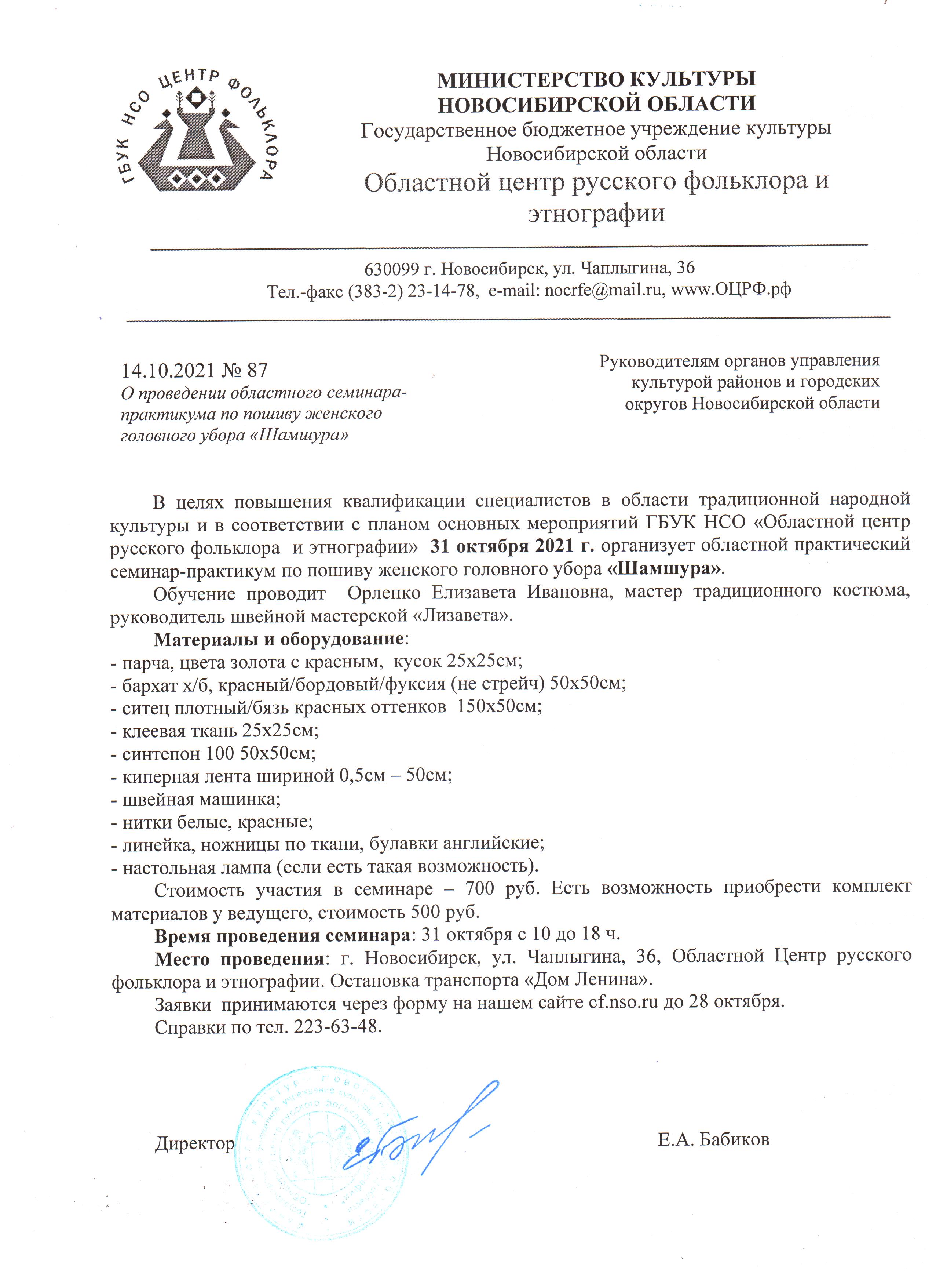 Практический семинар по пошиву женского головного убора «Шамшура» пройдет 14 ноября 2021 года в Областном центре русского фольклора и этнографии.